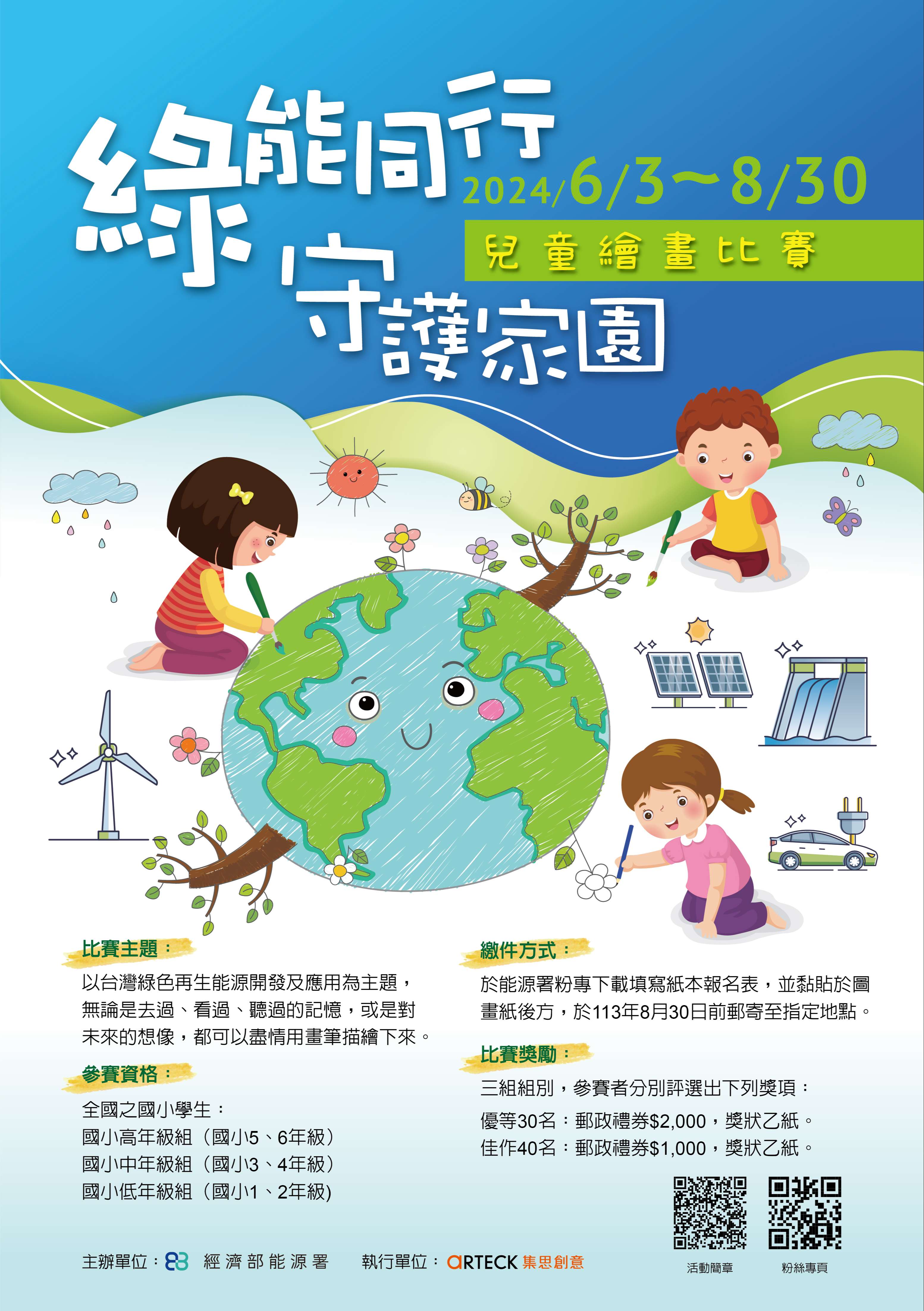 二、綠能發展不僅提升我國能源自主性及改善環境品質,為下一代奠定能源永續發展之基礎,該署舉辦2024「綠能同行守護家園」兒童繪畫比賽,鼓勵兒童以各式發展中之綠能為靈感,運用色彩及線條等彩繪方式,展現無限想像力及創造力。