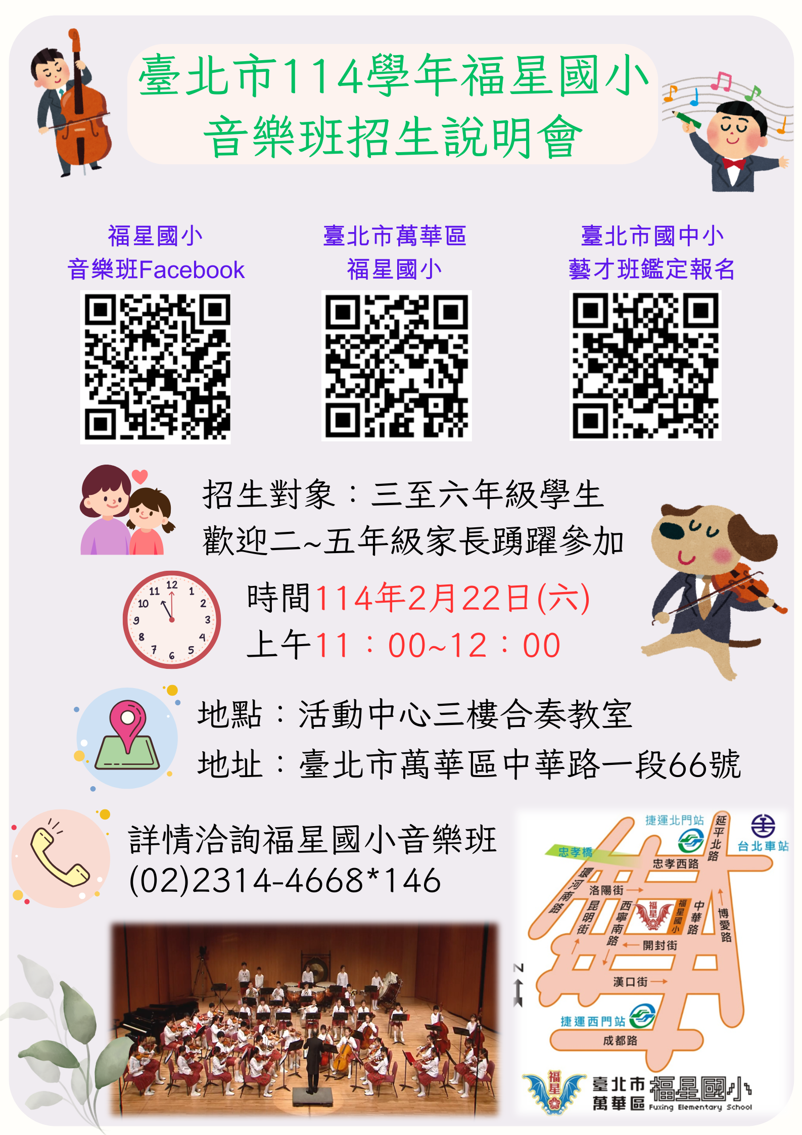 一、本校今年承辦臺北市114學年度國民小學藝術才能音樂班招 生。