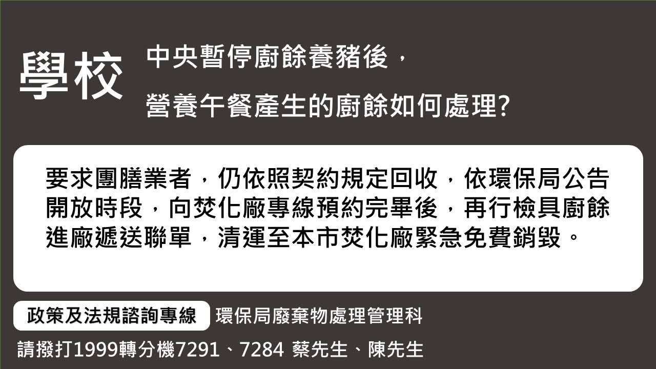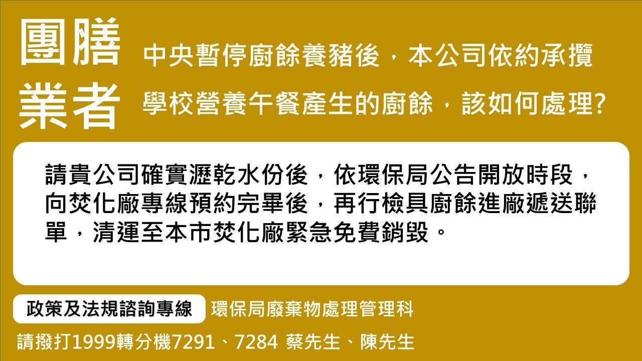 二、配合農業部宣布延長禁宰運、禁廚餘等防疫政策,該局調整延長開放非家戶廚餘進廠免費銷毀時間至114年11月5日止,每日上午8時至下午4時,並採專線預約方式預約進廠,各焚化廠地址及聯繫方式如下: