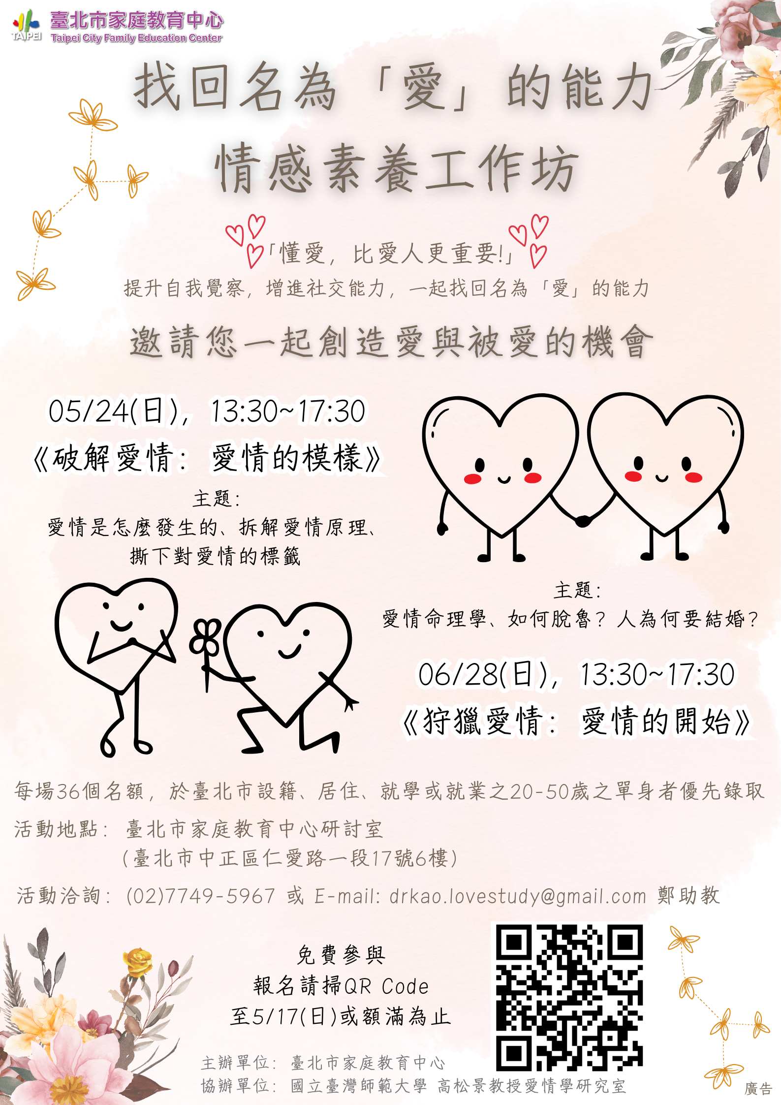 三、請鼓勵所屬單身同仁踴躍參與,並惠予協助於所屬網站宣傳,文稿內容如下:「臺北市家庭教育中心115年度『找回名為「愛」的能力—情感素養工作坊』,於5月24日及6月28日(星期日)13時30分至17時30分假臺北市家庭教育中心舉辦,活動名額為36人,歡迎年齡20歲以上至50歲之單身者踴躍報名參加(於本市設籍、居住、就學或就業者為優先錄取),活動全程免費參與,詳細內容可於中心網站