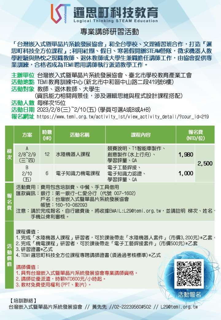 一、台灣嵌入式暨單晶片系統發展協會與本會主辦,於112年2月8-10日辦理【邏思町科技教育】專業講師研習活動, (2月8-9日水陸機器人課程)及 (2月10日電子知識力機電課 程),敬邀貴教師踴躍參加(研習資料詳見附件)。