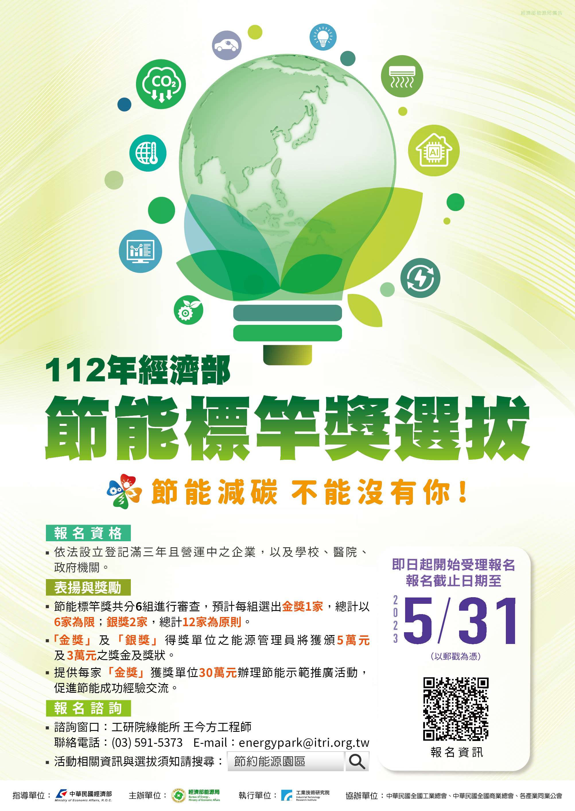 經濟部能源局委託財團法人工業技術研究院辦理「112年經濟部節能標竿獎表揚活動」,歡迎參閱報名!