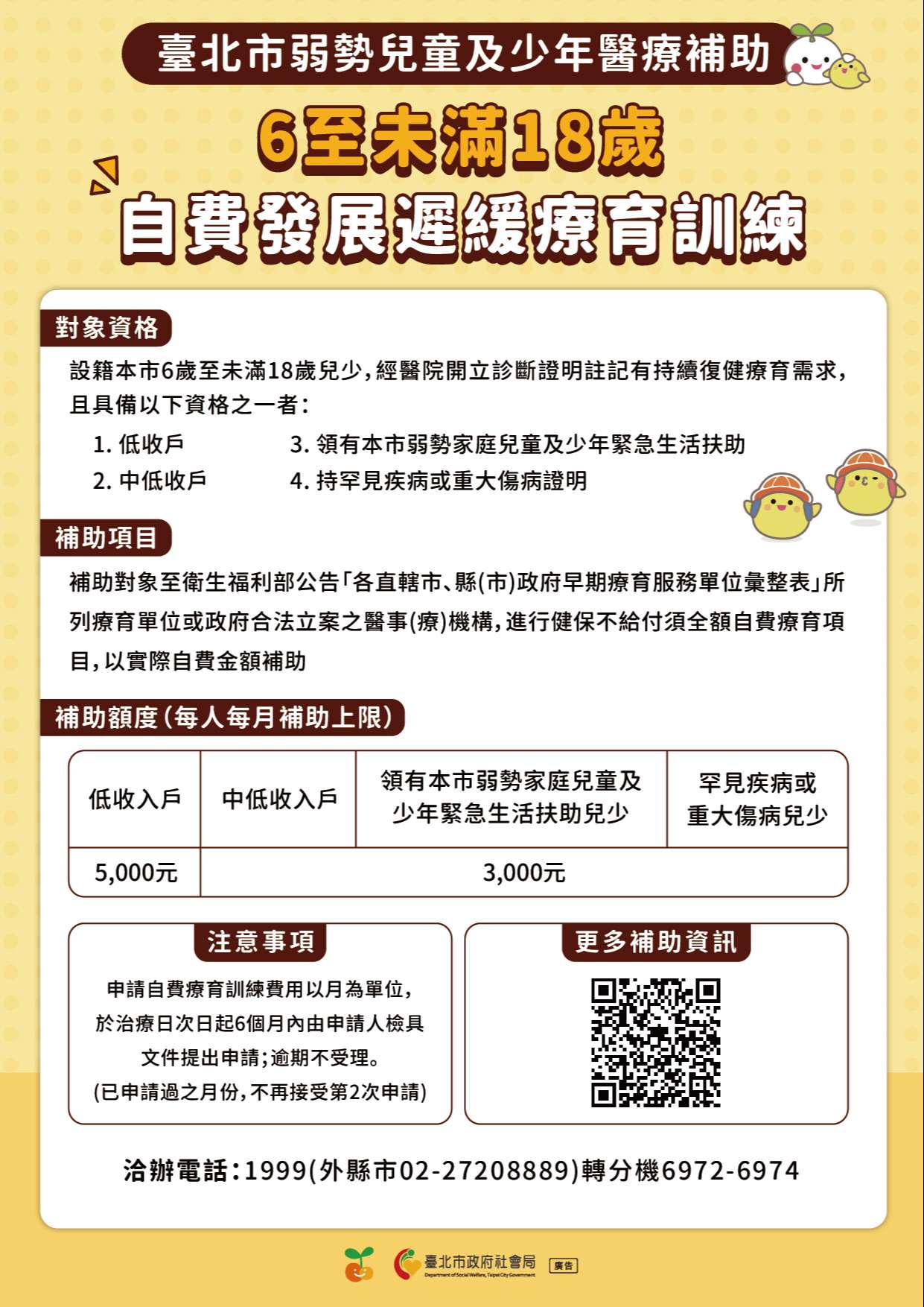 *檢附旨揭補助申請宣傳DM如附件,申請表件與說明資料請至本府社會局網站(網址:https:// www.dosw.gov. taipei/)首頁/兒童與少年服務/生活經濟扶(補)助/臺 北市弱勢兒童及少年醫療補助下載;如有疑問請致電02-27208889/1999轉6972-4。