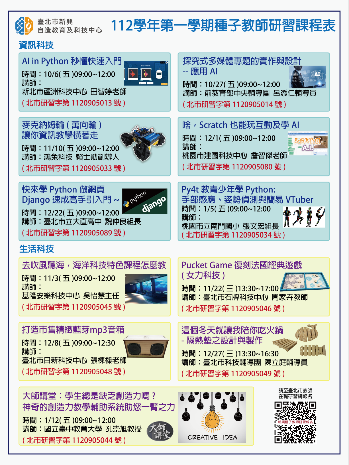 (一)「去吹風聽海,海洋科技特色課程怎麼教」: 112年11月 3日(五)上午9時至12時,共計3小時, 講師:基隆市安 樂科技中心 吳怡慧主任