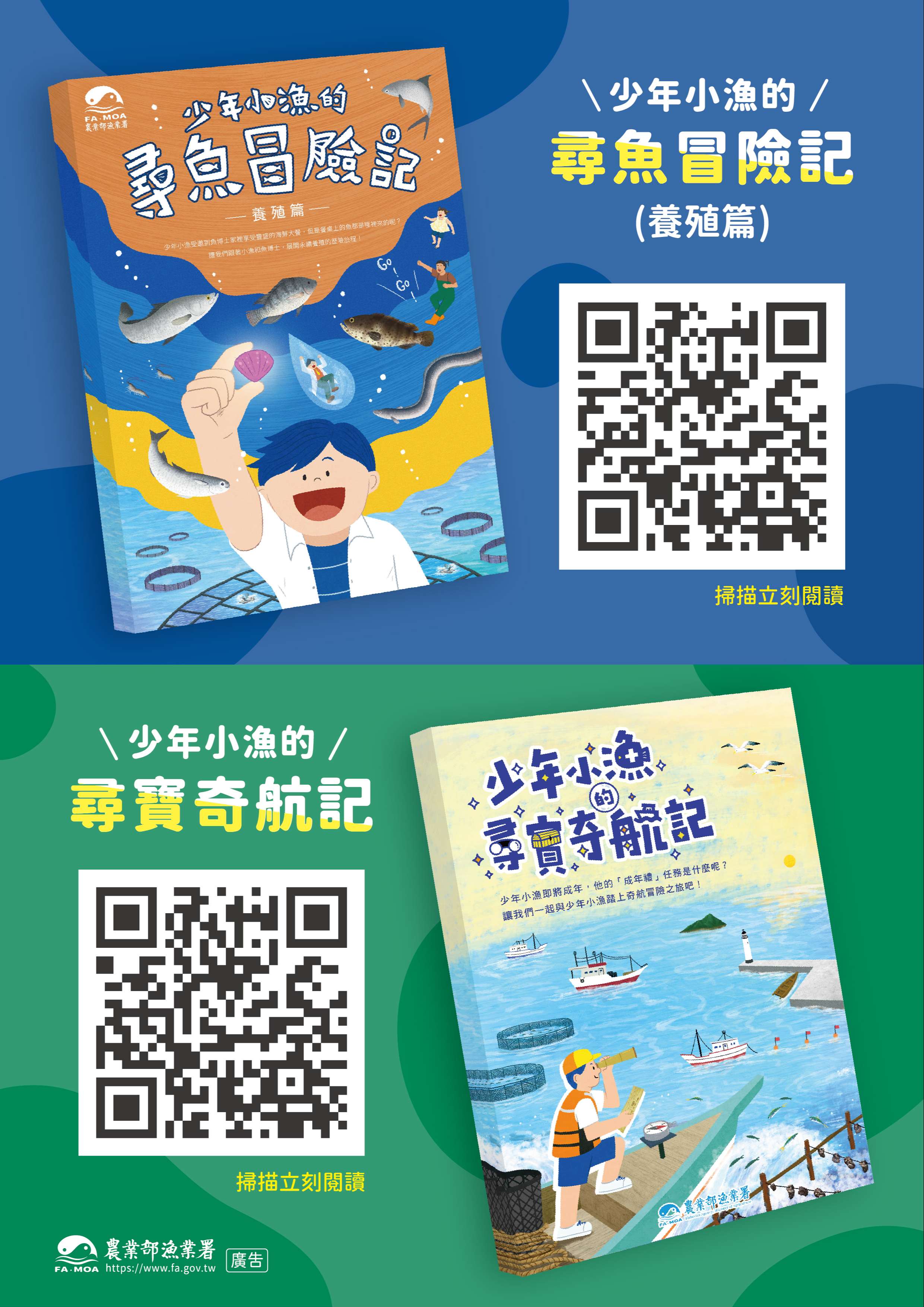 農業部漁業署出版之「少年小漁的尋寶奇航記」及「少年小漁的尋魚冒險記(養殖篇)」電子繪本之宣傳圖卡