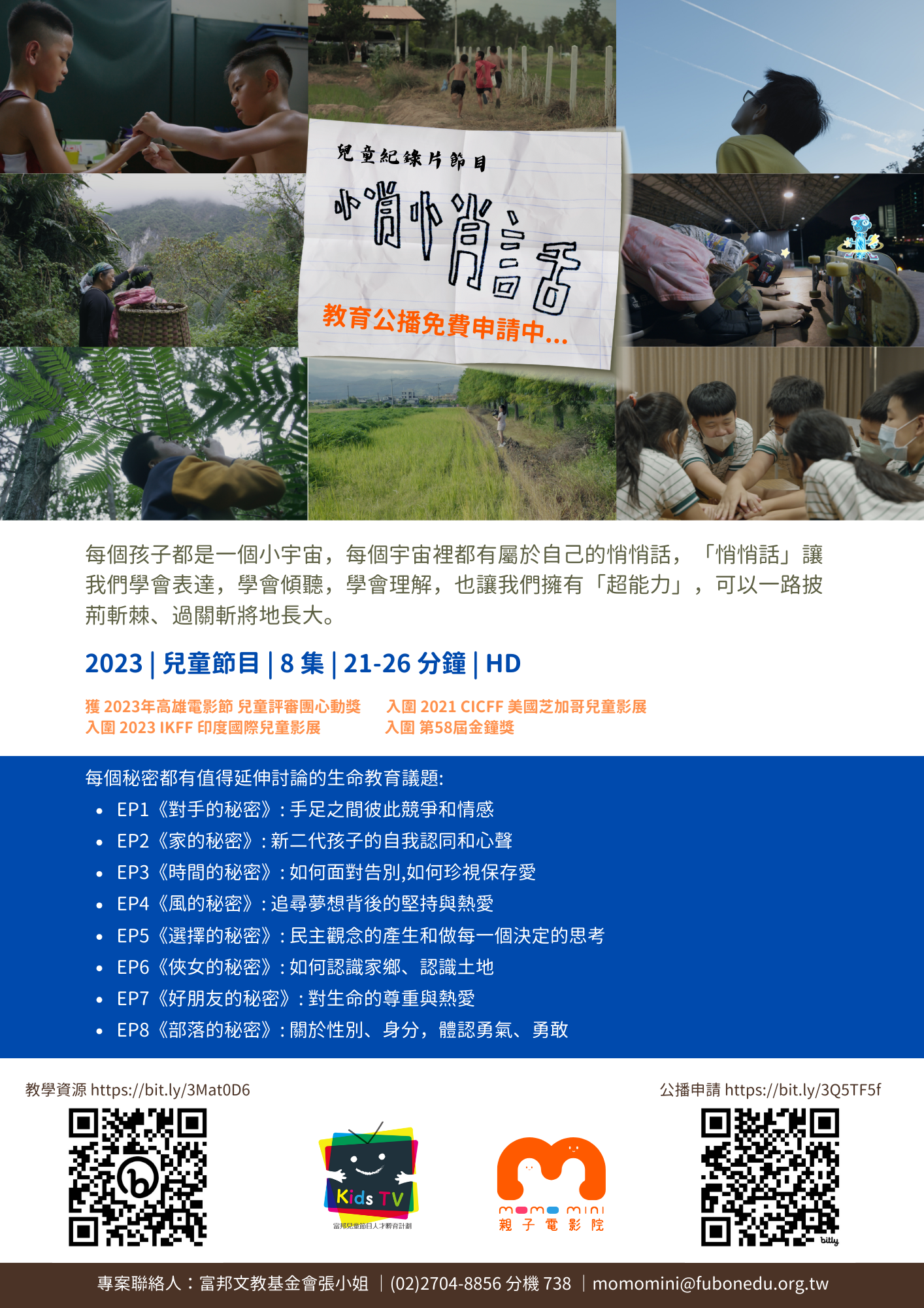 一、對於兒童權益和媒體素養長期關注的富邦文教基金會,自 2019年開始致力於推動執行自製兒童節目。今年推出全新兒童紀錄片節目《悄悄話》,同時備有節目相關教學資源及教學活動學習單,歡迎教師使用。