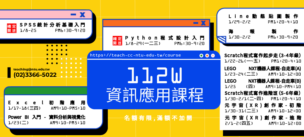 二、該中心112W和1122資訊應用課程共開設五大系列課程:程式設計、統計分析、影像處理、文書處理、兒童班系列, 活動海報與課程一覽表如附件。
