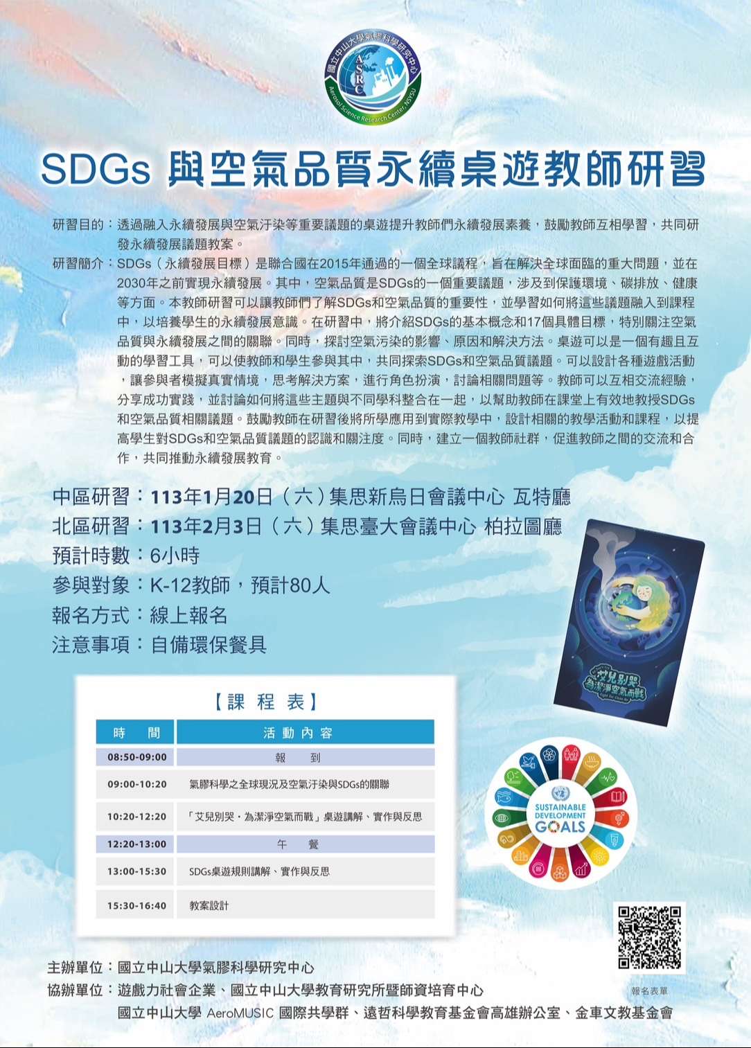 一、金車文教基金會長期深耕國際素養教育,定期辦理教師增能課程,本次擔任國立中山大學氣膠科學研究中心辦理之「SDGs與空氣品質永續桌遊教師研習」協辦單位,旨在培訓國小至大專院校各級空氣品質教育種子教師,了解SDGs 和空氣品質的重要性,並學習如何將議題融入課程中,以培養學生之永續發展意識。