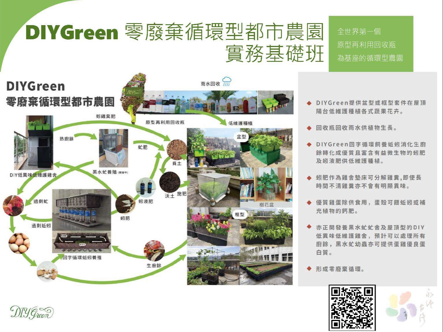 二、DIYGreen 循環型都市農園是全世界第一個以回收瓶為基座的 DIY 循環型農園。可在水泥地上創造出綠地供種蔬果花卉,適合從小孩至長者所有年齡層DIY施作;有關DIYGreen單盆體驗班及DIYGreen盆型基礎班兩門課程,詳細課程訊息及報名請至https://reurl.cc/krrY6n,檢附課程DM一份。