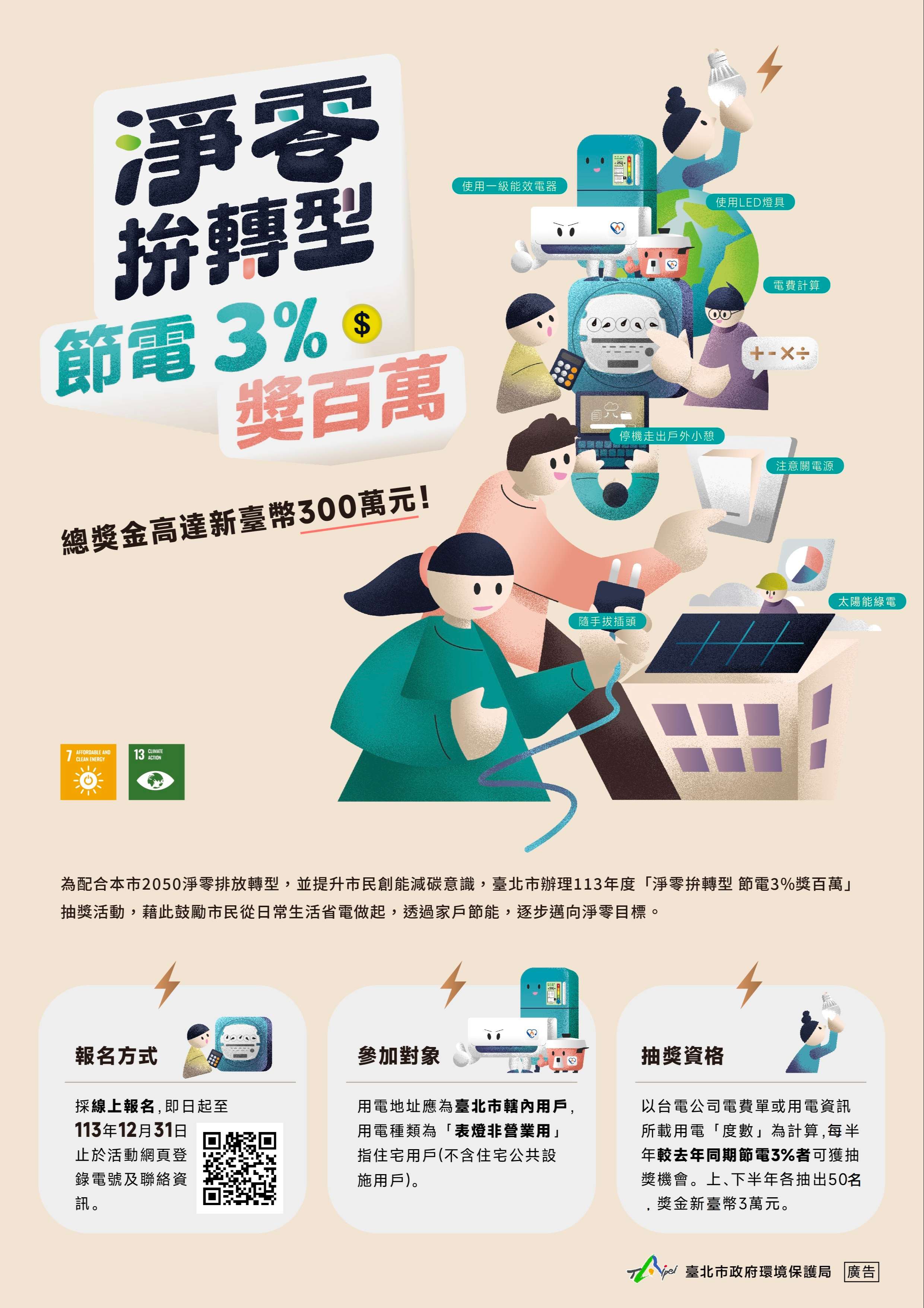 為鼓勵市民落實節能減碳行動,本局推出「淨零拚轉型節電3%獎百萬」抽獎活動(網址:https://energysaving.gov.taipei/),即日起至113年12月31日辦理。