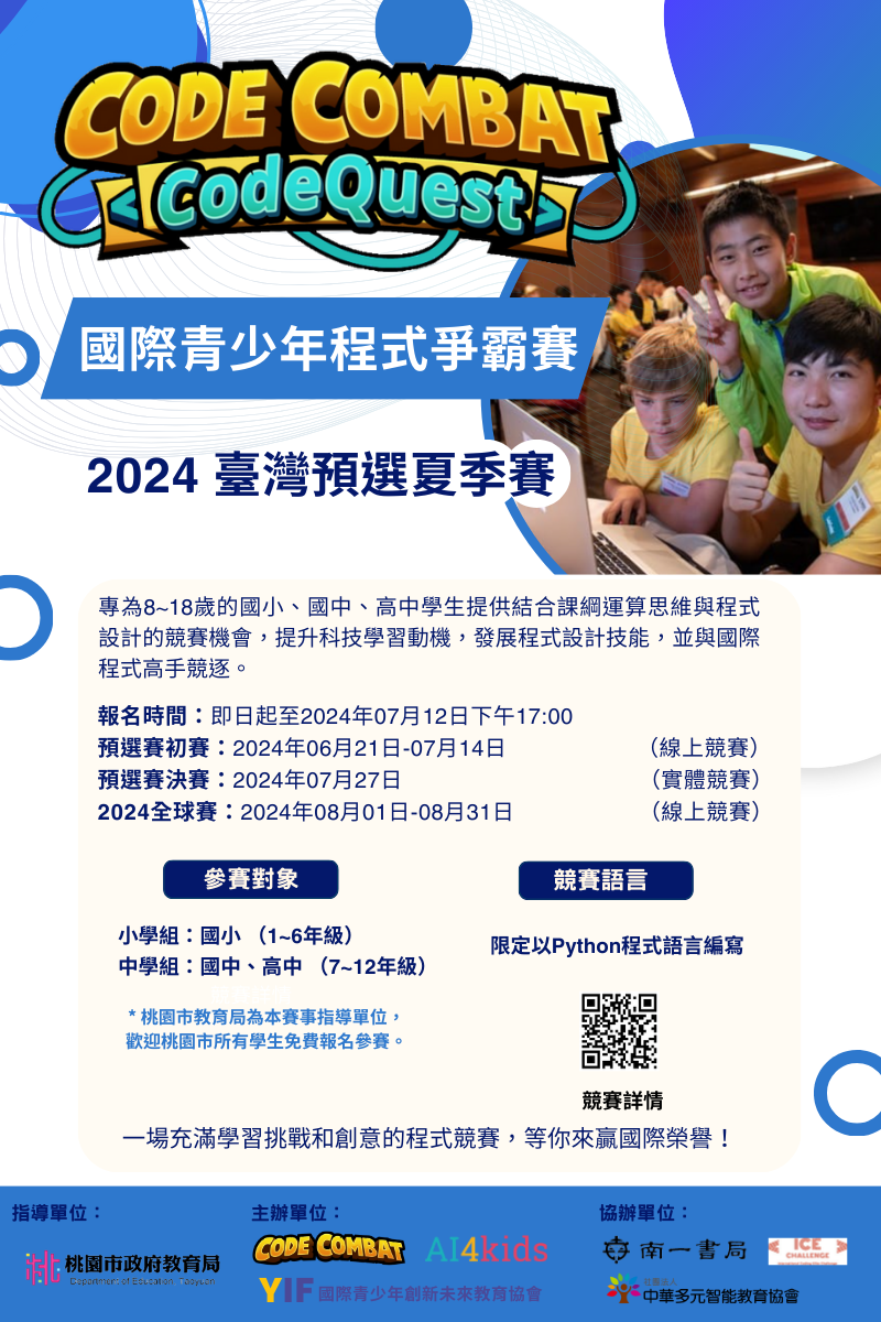 一、2024年暑假,社團法人國際青少年創新未來教育協會攜手 AI4kids、南一出版社、中華多元智能教育協會,為8~18歲的國小、國中、高中學生提供結合08課綱資訊素養的運算思維暨程式設計競賽機會,提升科技學習動機,發展程式設計技能,並與國際程式高手競逐。