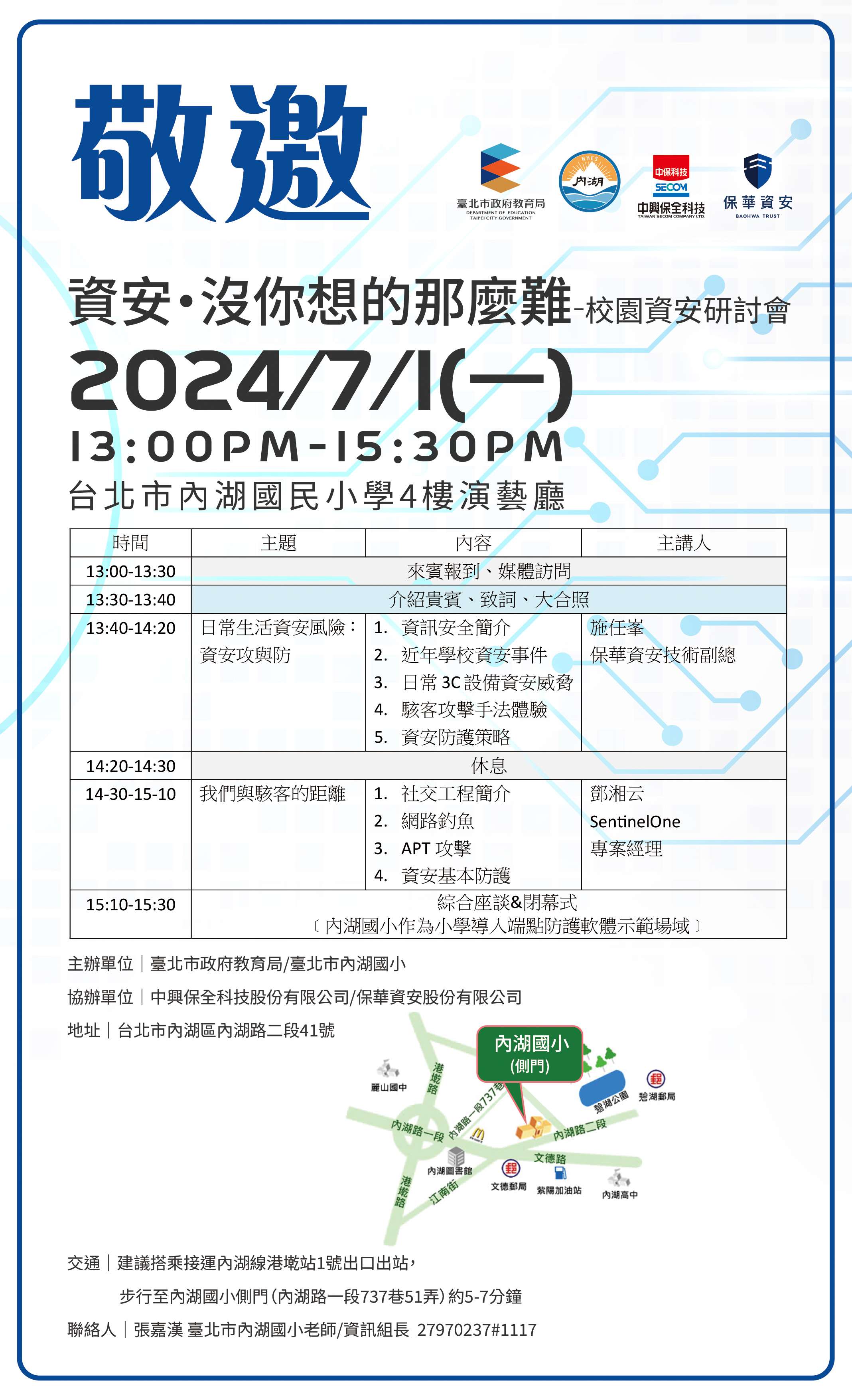 為因應數位科技的迅速發展,提升教師資訊安全知能,故辦理此研討會,旨揭活動資訊說明如下:
