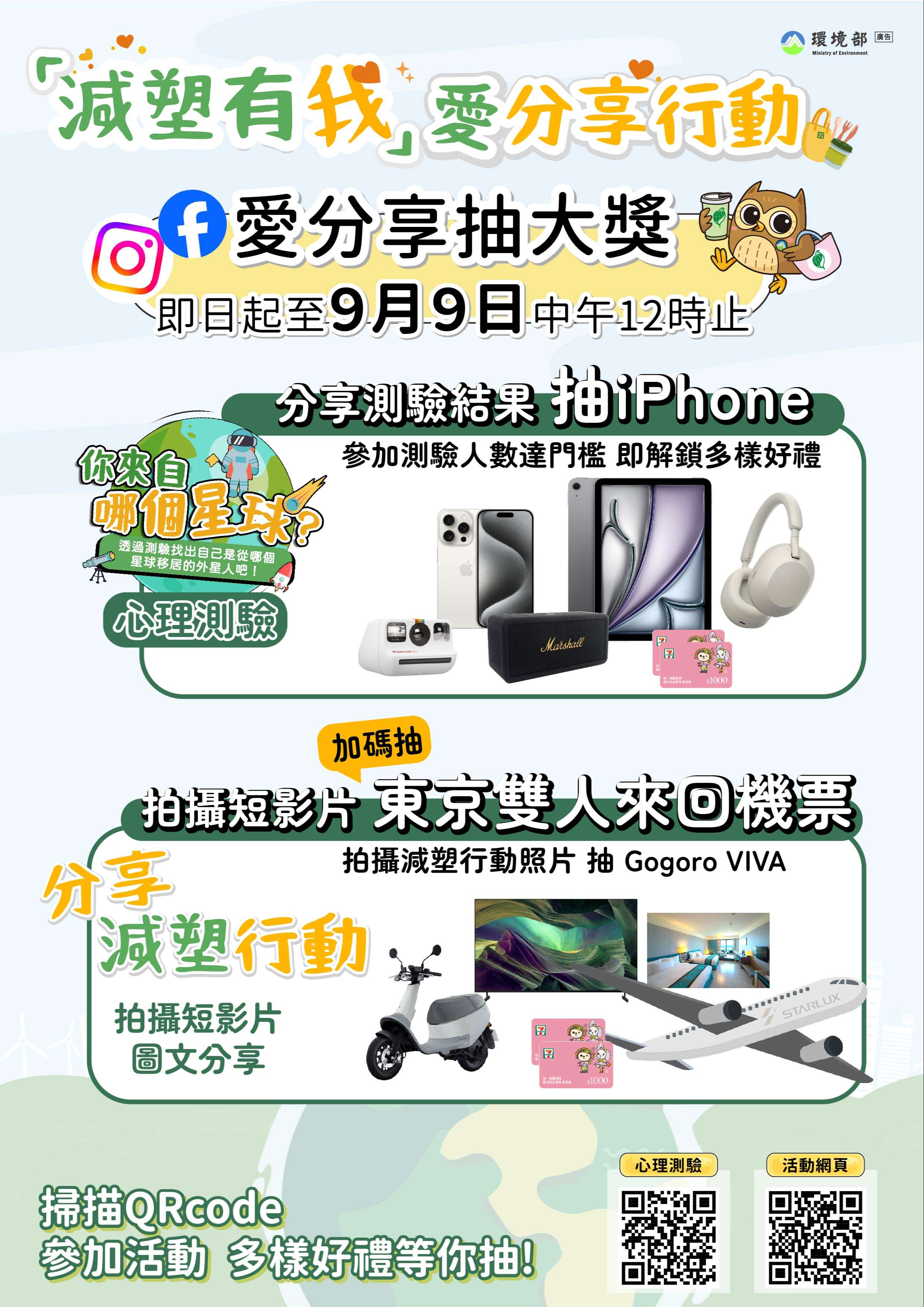 二、環境部為鼓勵社會大眾及莘莘學子在暑期假期間一起跟上全球減少塑膠的風潮,特辦理「減塑有我」愛分享行動,可透過臉書(Facebook)、Instagram(IG)等社群媒體,拍攝個人生活中減塑短影片、減塑生活照片,並可透過參加「你來自哪個星球?」心理測驗遊戲,瞭解並發覺屬於自己獨特的環保行動,歡迎民眾邀請親朋好友一起在生活中響應減塑行動,參加旨揭活動拿大獎。