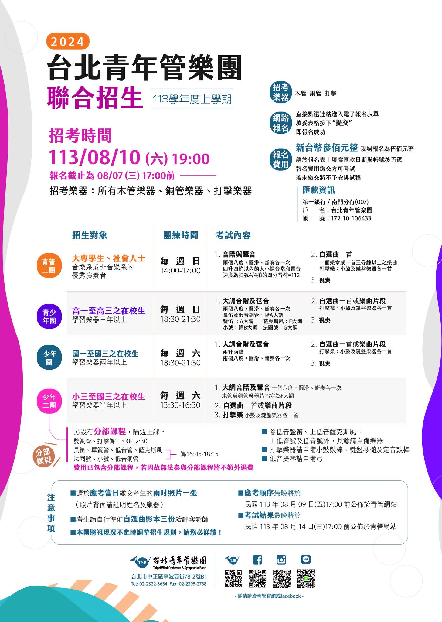 (四)相關招生資訊請至臺北青年管樂團臉書粉絲專頁查詢