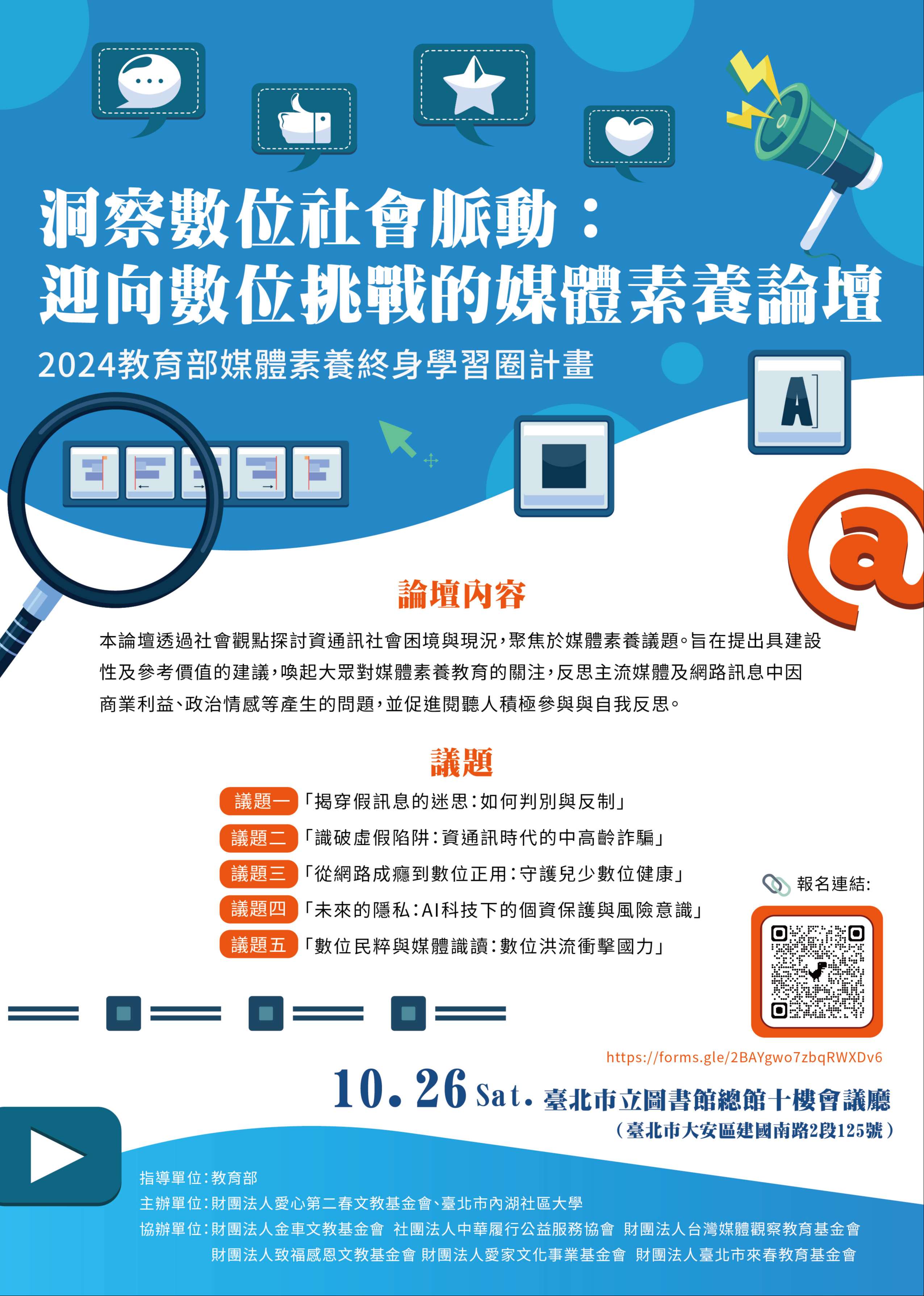 一、本論壇旨在提出具建設性及參考價值的建議,喚起大眾對媒體素養教育的關注,反思主流媒體及網路訊息中因商業利益、政治情感等產生的問題,並促進閱聽人積極參與與 自我反思。