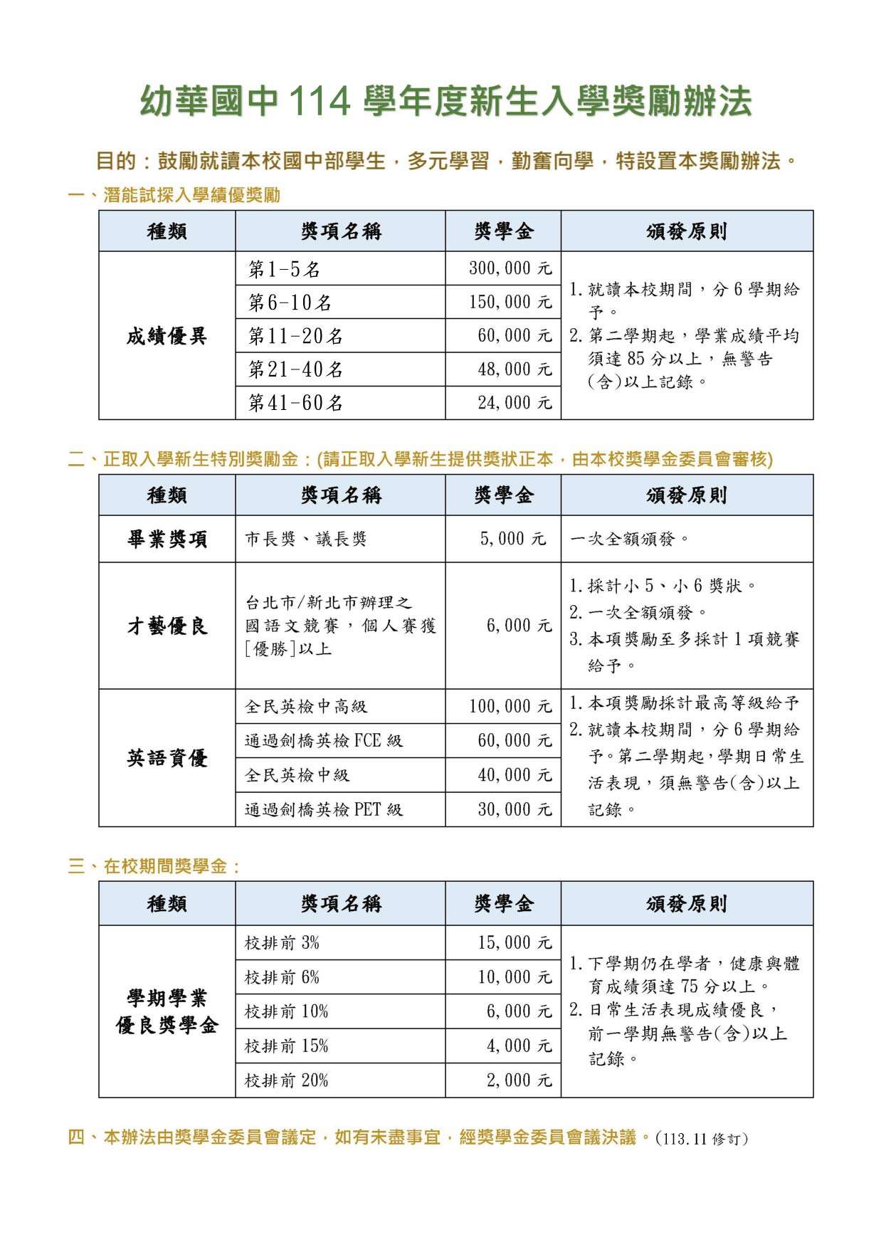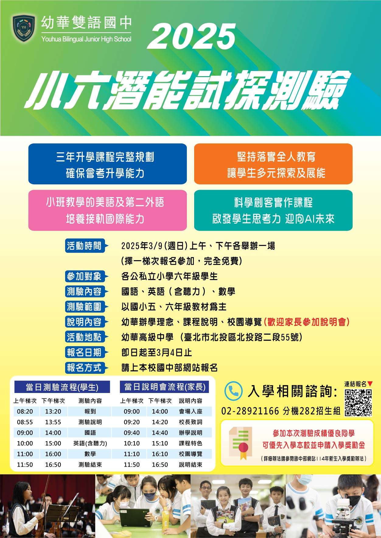 幼華雙語國中辦理 「114學年度小六生潛能試探」,敬 請 貴校協助公告週知。