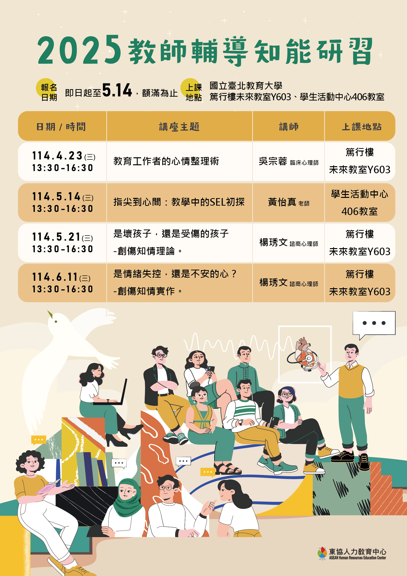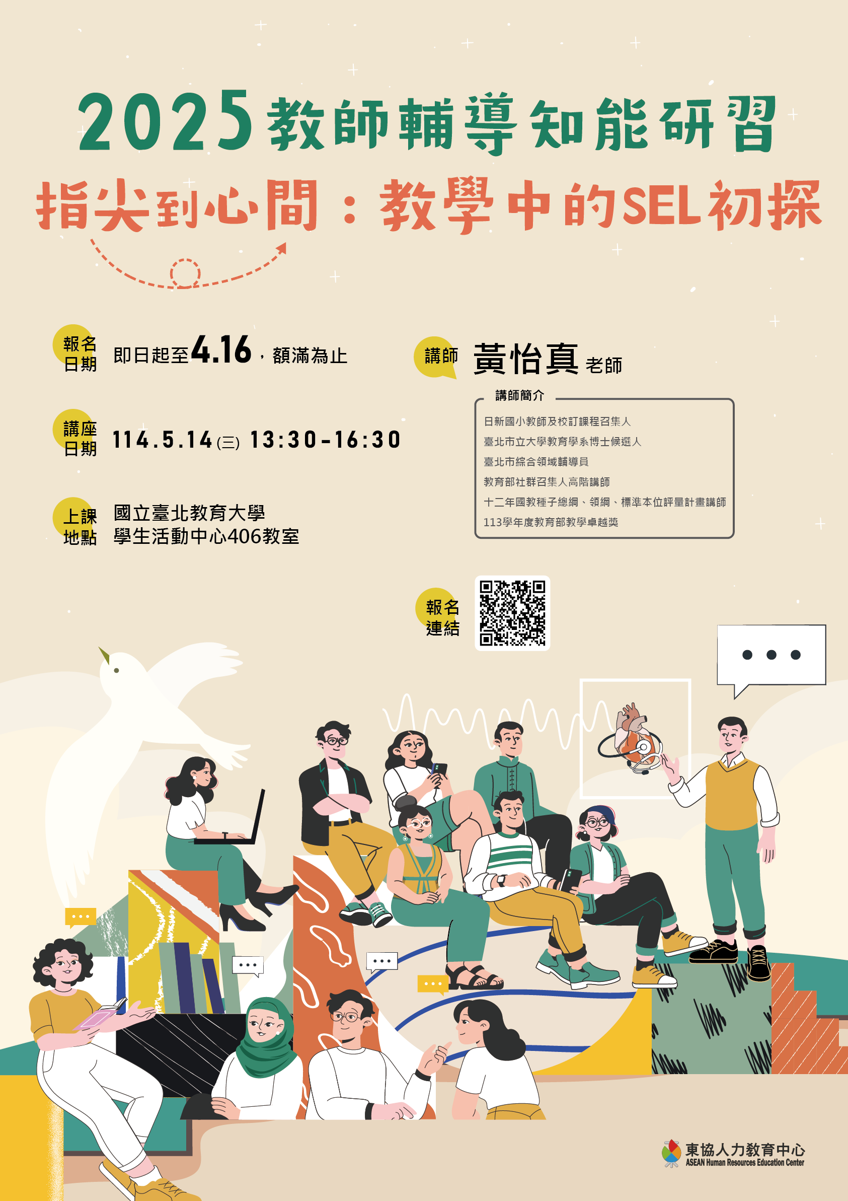 主旨:本校東協人力教育中心舉辦「教育部114年度社會責任實 踐計畫-2025教師輔導知能研習」,敬請推薦貴校教師及 教支人員報名參加並予以公假,請查照。 說明: