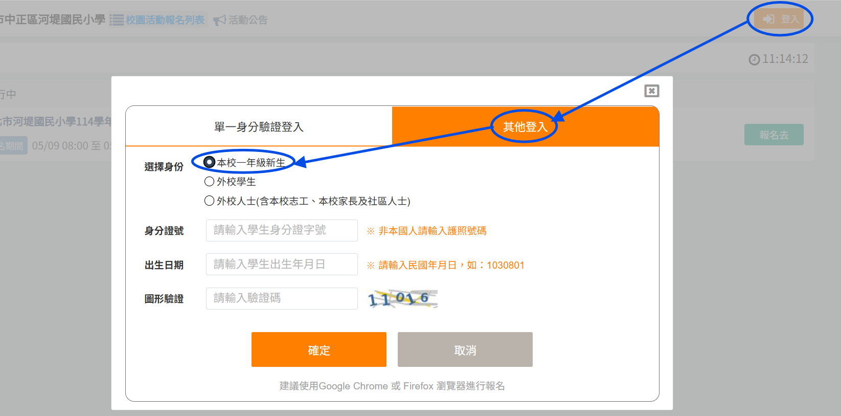 如單一身分登入後跳轉至二代校務系統,請重點連結使用<其他登入-身分請選本校一年級新生>,並填妥下方資訊後登入。