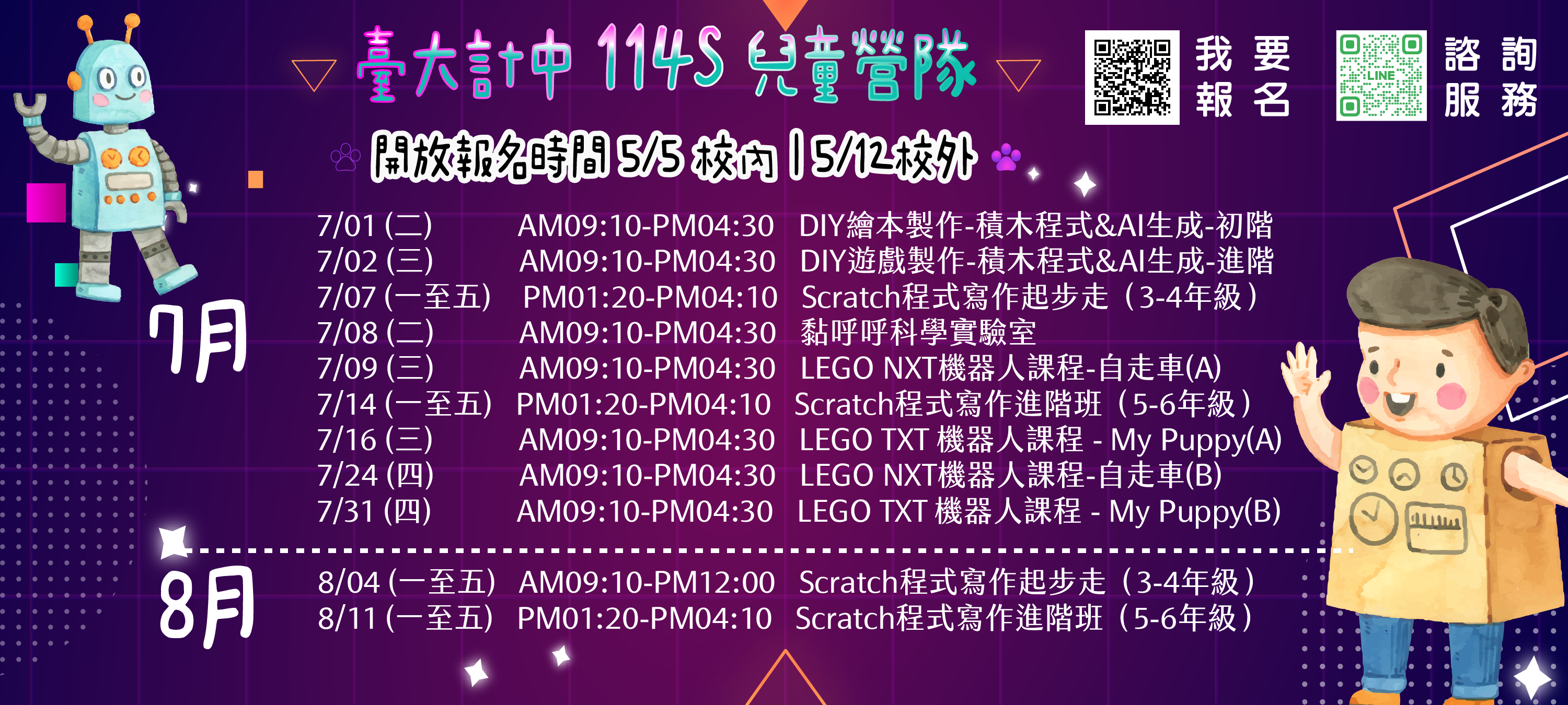 一、臺灣大學計算機及資訊網路中心於114年6月18日起辦理暑假資 訊應用課程,課程詳細資訊與報名網址請至該中心網站查 詢https://teach.cc.ntu.edu.tw/course。