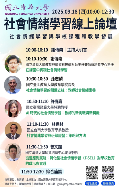 主旨:轉知國立清華大學訂於114年9月18日(星期四)上午10時 至12時30分,辦理「社會情緒學習-社會情緒學習與學校 課程和教學發展」線上論壇一案,請查照。