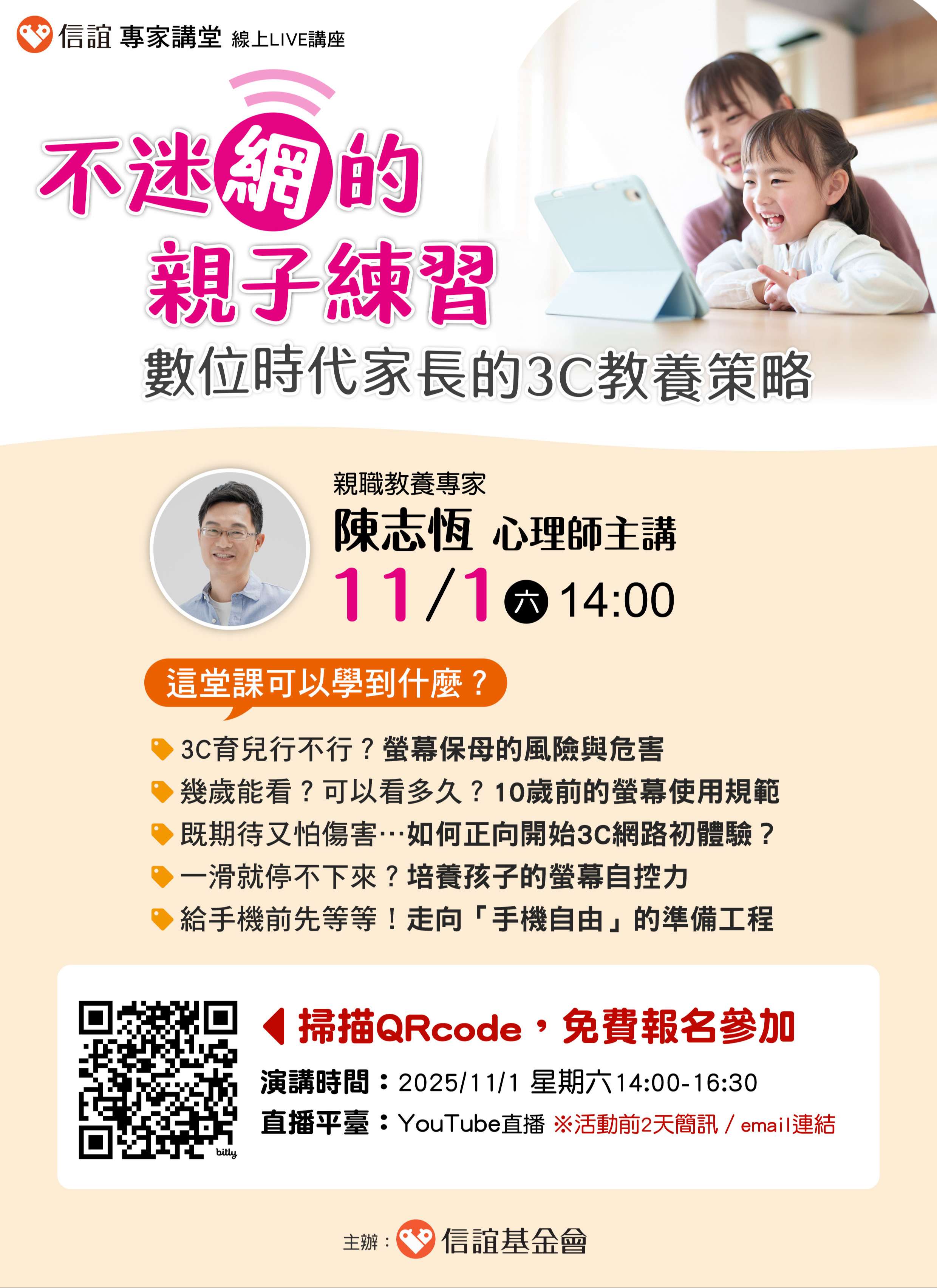 一、面對數位裝置普及、AI浪潮來襲,教養挑戰正不斷升級。 唯有從「家」出發,啟動正向3C教養策略,才能讓數位工 具成為孩子成長的助力,而非阻力。信誼將於2025年11月1 日(六)下午2:00-4:30舉辦【不迷「網」的親子練習: 數位時代家長的3C教養策略】線上LIVE 講座,邀請家長免 費報名參加。