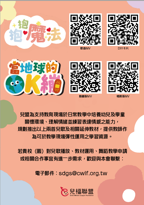 主旨:敬邀貴校參考並運用本會(財團法人中華民國兒童福利聯盟基金會)推出之原創兒歌《當地球的 OK 繃》及《抱抱魔法》教學資源,陪伴孩子於唱跳與創作中 學習環境關懷與情感表達,請查照。