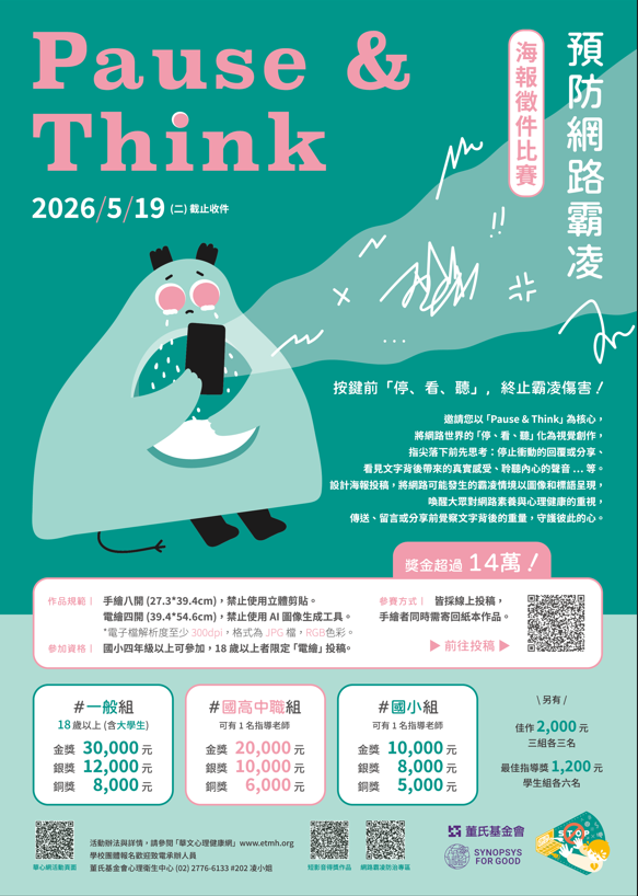 二、為提升兒童與青少年、老師及社會大眾對網路霸凌議題的 重視,關心網路使用素養與心理健康的影響,本會舉辦 【Pause & Think】停止網路霸凌海報徵件比賽,即日起開 始收件至民國115年5月19日止,邀請學生與老師以手繪或 電繪方式創作海報投稿,得獎作品可獲獎金,國小組金獎 一萬元、國高中職組金獎兩萬元、一般組金獎三萬元… 等,共30個獎項,總獎金超過14萬元。活動辦法請參閱 https://reurl.cc/lpRGLE 。