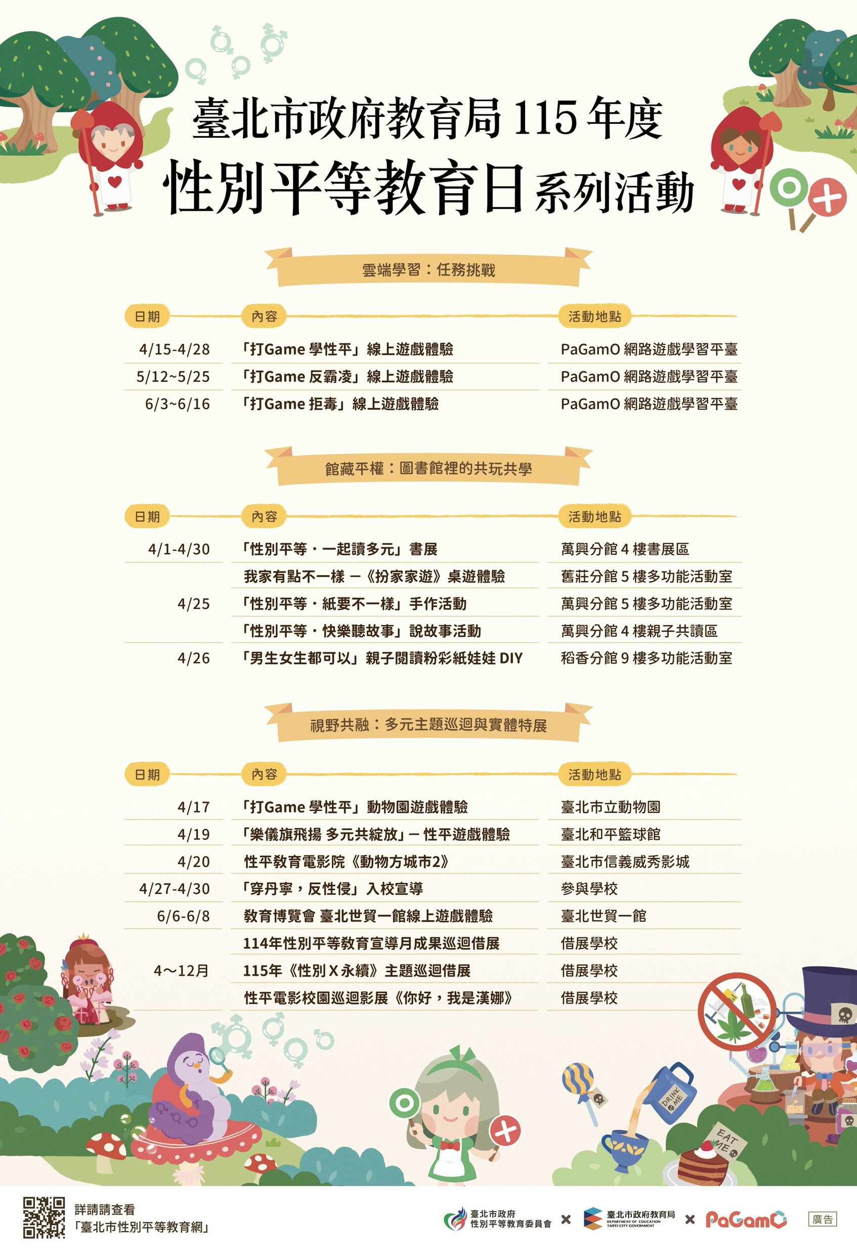 主旨:檢送本市115年度性別平等教育日海報1份,請貴校協助 公 布於電子布告欄及校網,並鼓勵親師生參與相關活 動。